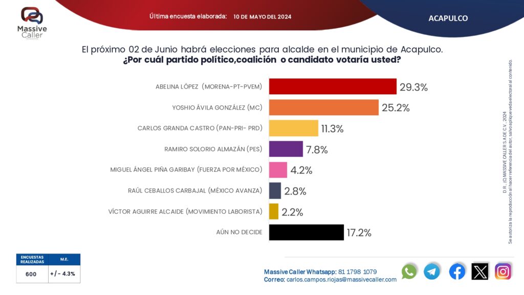 Insistió en que el empate técnico es entre los tres, Granda, Yoshio y Solorio, pero respecto a los resultados dados a conocer también el sábado por Massive Caller publica una caída de dos puntos en las preferencias electoral del 03 de mayo al 10, al pasar de 31.3 por ciento al 29.3, afirmó que para él son encuestas pagadas que pues lamentablemente “hacen circo, maroma y teatro para poder intentar confundir a la sociedad, lo cual no va a ocurrir porque hoy tenemos una sociedad muy informada y que sabe y que conoce a Abelina y que están muy convencidos de que este 2 de junio van a votar por ella”.