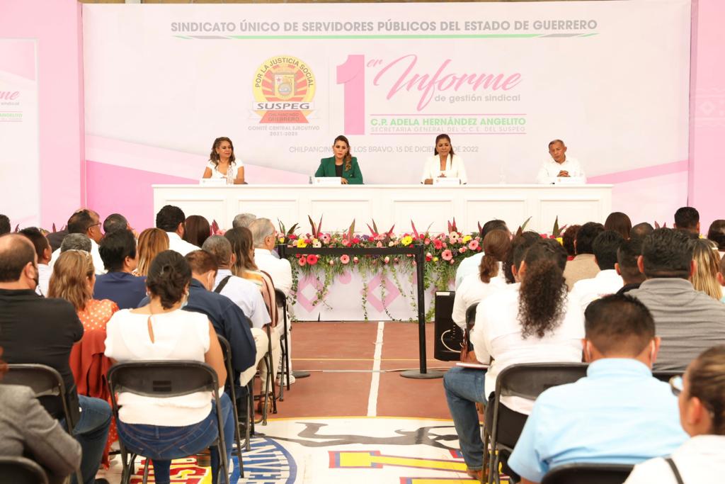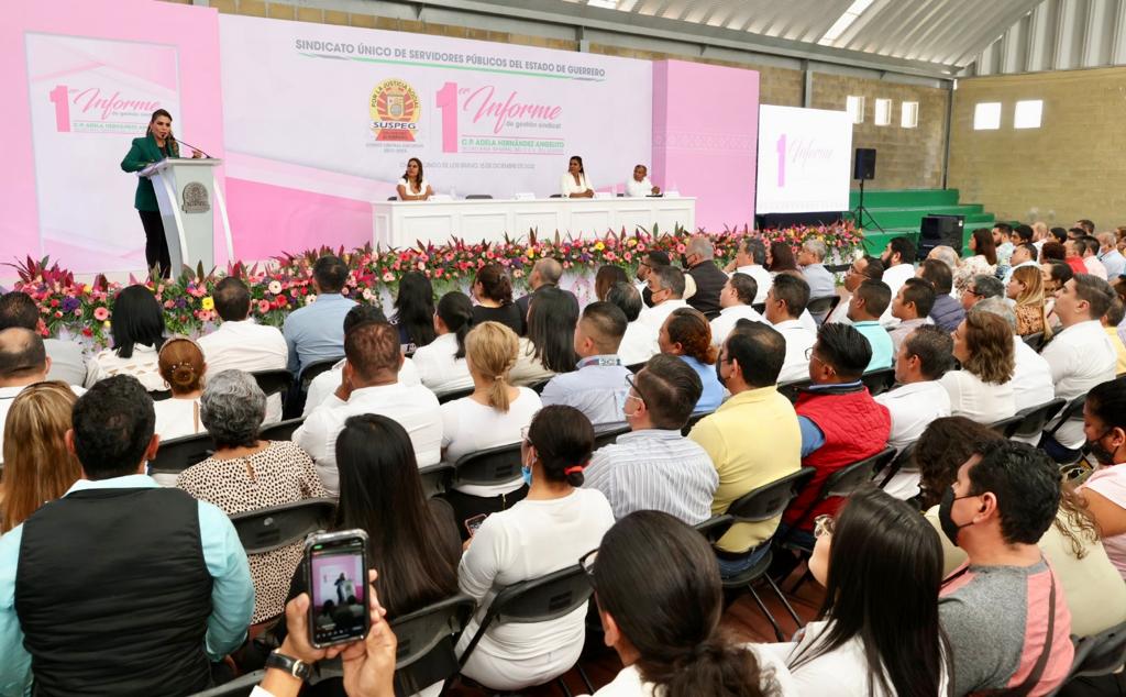 La gobernadora Evelyn Salgado Pineda, refrendó su compromiso con fortalecer los derechos y conquistas sindicales de la base trabajadora del estado, además de cumplir en tiempo y forma con las prestaciones de ley, expresó lo anterior, al asistir al Primer Informe de Gestión Sindical de la Secretaria General del SUSPEG, Adela Hernández Angelito, donde reconoció los resultados en favor de este gremio que se suman para lograr la consolidación de la transformación del estado de Guerrero.