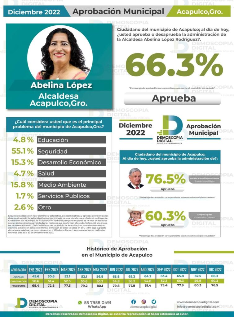 De acuerdo con datos de la empresa de estudios de opinión, Demoscopia Digital, en los resultados del mes de diciembre de 2022, la alcaldesa que gobierna el municipio más importante de Guerrero, reportó una aprobación del 66.3 por ciento, contrastando de manera positiva con enero de ese mismo año, cuando registró un 49.6 por ciento.