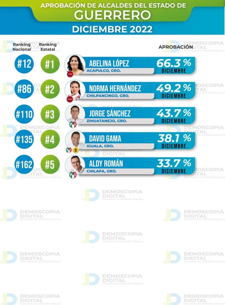 Abelina López, se encuentra en la primera posición de un listado de cinco alcaldes de Guerrero que aparecen en la encuesta, superando a municipios como Chilpancingo, Zihuatanejo, Iguala y Chilapa.