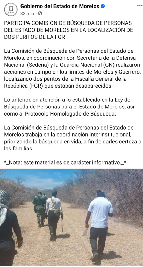 La Comisión de Búsqueda de Personas del Estado de Morelos, en coordinación con Secretaría de la Defensa Nacional (Sedena) y la Guardia Nacional (GN) informó que llevaron a cabo acciones en campo en los límites de Morelos y Guerrero, localizando dos peritos de la Fiscalía General de la República (FGR) que estaban desaparecidos.