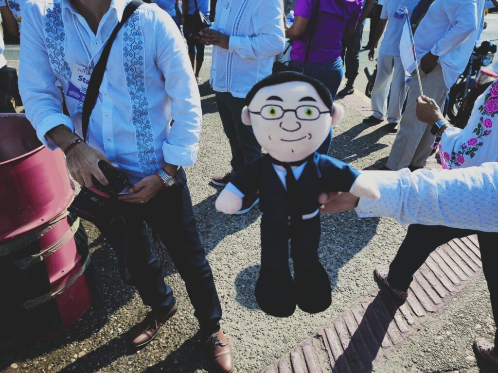 Una persona joven del sexo masculino exhibe un pequeño muñeco de Ebrard, tal como el AMLito.