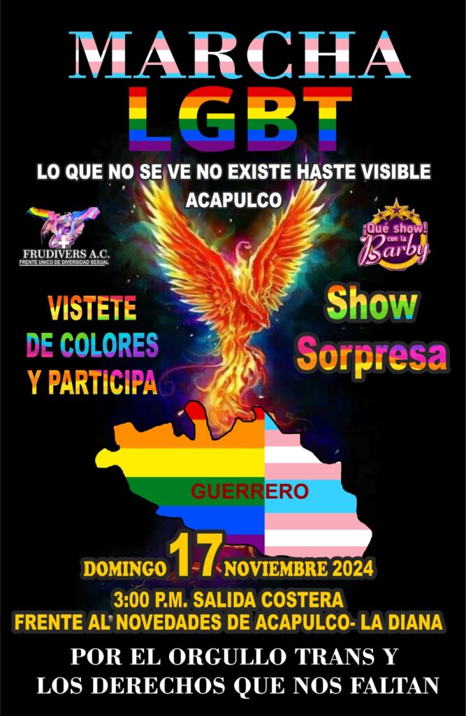 “Como sabemos se acaba de aprobar en el estado de Guerrero este exhorto hacia nuestra población donde tener un día donde podamos nosotras expresarnos y sobre todo hacernos visibles, no en nuestra lucha, nuestros logros y hoy, pues bueno, estamos aquí reunidos, reunidas con nuestras compañeras para pues hacer la remembranza de la visibilización a este día y sobre todo también para invitar a la marcha LGBT que se va a llevar a cabo el próximo domingo 17 de noviembre a las 3 de la tarde partiendo de aquí de Novedades de Acapulco, desaparecido, hacia La Diana, en una marcha pacífica, en una marcha de visibilidad, de una mancha de inclusión y sobre todo de respeto hacia nuestras identidades y sobre todo también para hacer el llamado ya que se han registrado en varios casos de personas LGBT donde pues bueno, aún siguen siendo discriminadas, tienen acoso laboral”, concluyó.