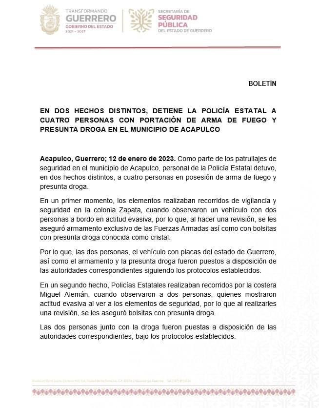 Como parte de los patrullajes de seguridad en el municipio de Acapulco, personal de la Policía Estatal detuvo, en dos hechos distintos, a cuatro personas en posesión de arma de fuego y presunta droga.