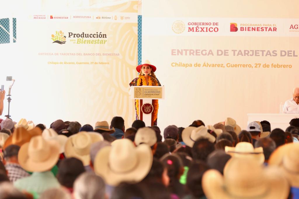 La gobernadora Evelyn Salgado Pineda y el delegado de los programas sociales en Guerrero, Iván Hernández Díaz, encabezaron la entrega de tarjetas de banco del Programa «Producción para el Bienestar», con el objetivo de fortalecer la autosuficiencia alimentaria en beneficio directo a más de 164 mil mujeres y hombres campesinos que producen en una superficie de 378 mil hectáreas del territorio estatal con una inversión federal anual de 982 millones de pesos.