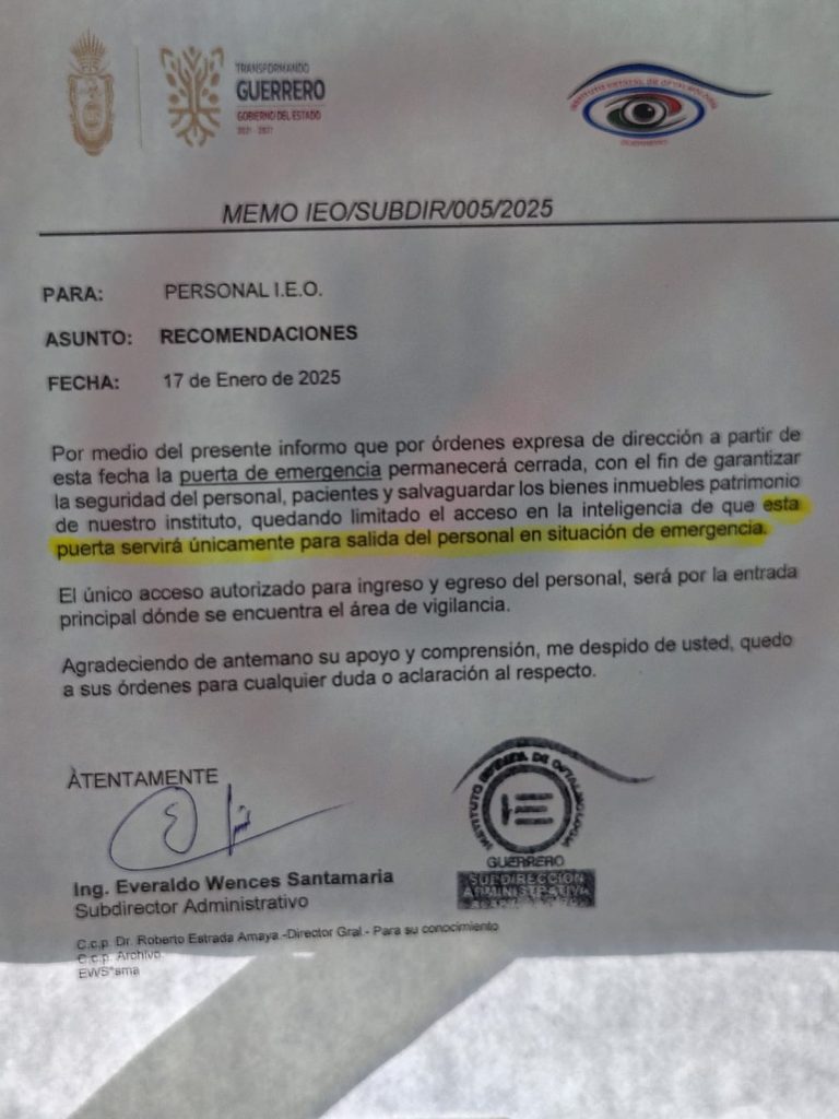 La médica señaló que también el médico les bloqueó el acceso de emergencia, ordenando a un policía de seguridad que pegara el memo IEO/SUBDIR/005/2025 en el que el subdirector administrativo avisa que la «puerta servirá únicamente para salida del personal en situación de emergencia», pese a que eso los pone en riesgo ante alguna eventualidad sísmica.