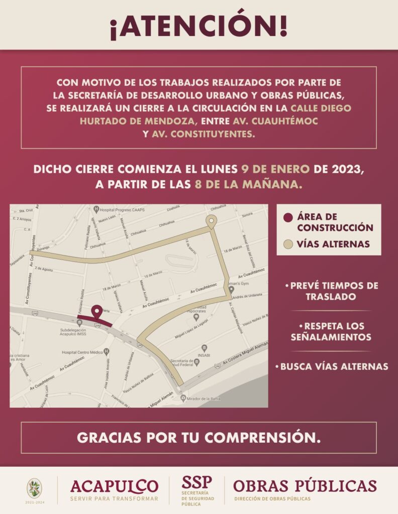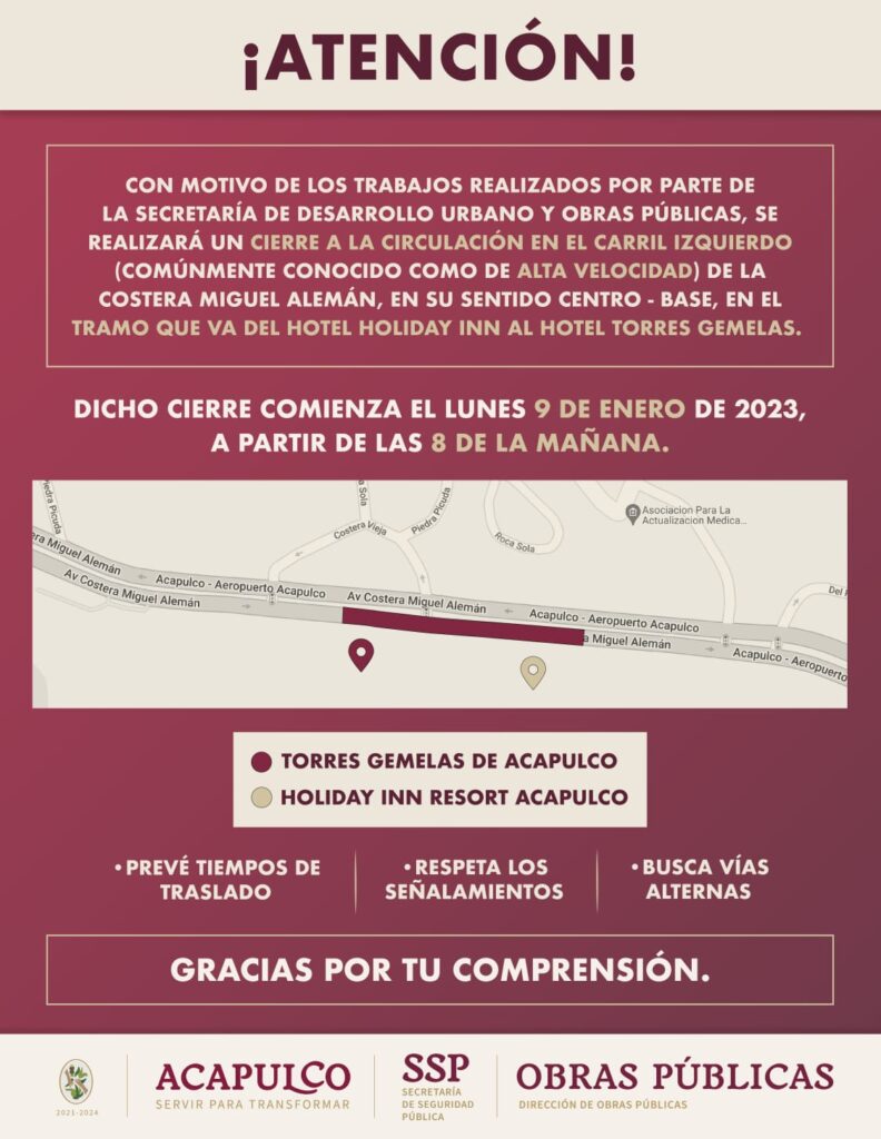 Por la reactivación de los trabajos que fueron suspendidos debido al periodo vacacional de invierno, el Gobierno Municipal informa a la población que las obras se reanudarán mañana lunes 09 de enero, por lo que se recomienda a la población prever sus tiempos de traslado ante el cierre de tramos viales en la avenida Costera Miguel Alemán y de la calle Diego Hurtado de Mendoza.